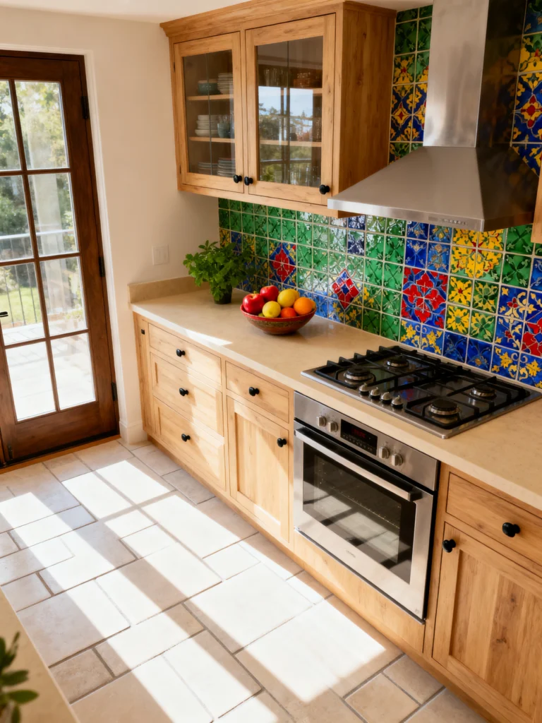 I love how the light-toned wood cabinetry acts as a perfect, grounded counterpoint to all that intense pattern. And let’s appreciate how that single bowl of fresh apples and citrus on the counter perfectly echoes the colors in the backsplash! It’s all in the details, right? The terracotta tiled floor catches the bright sunbeams, creating a beautiful patchwork of light. Even the view out that glass door to the greenery outside adds a layer of freshness. This kitchen feels adventurous, warm, and absolutely full of life. It’s a daily reminder that design is a journey, and this particular path is full of color and spice.