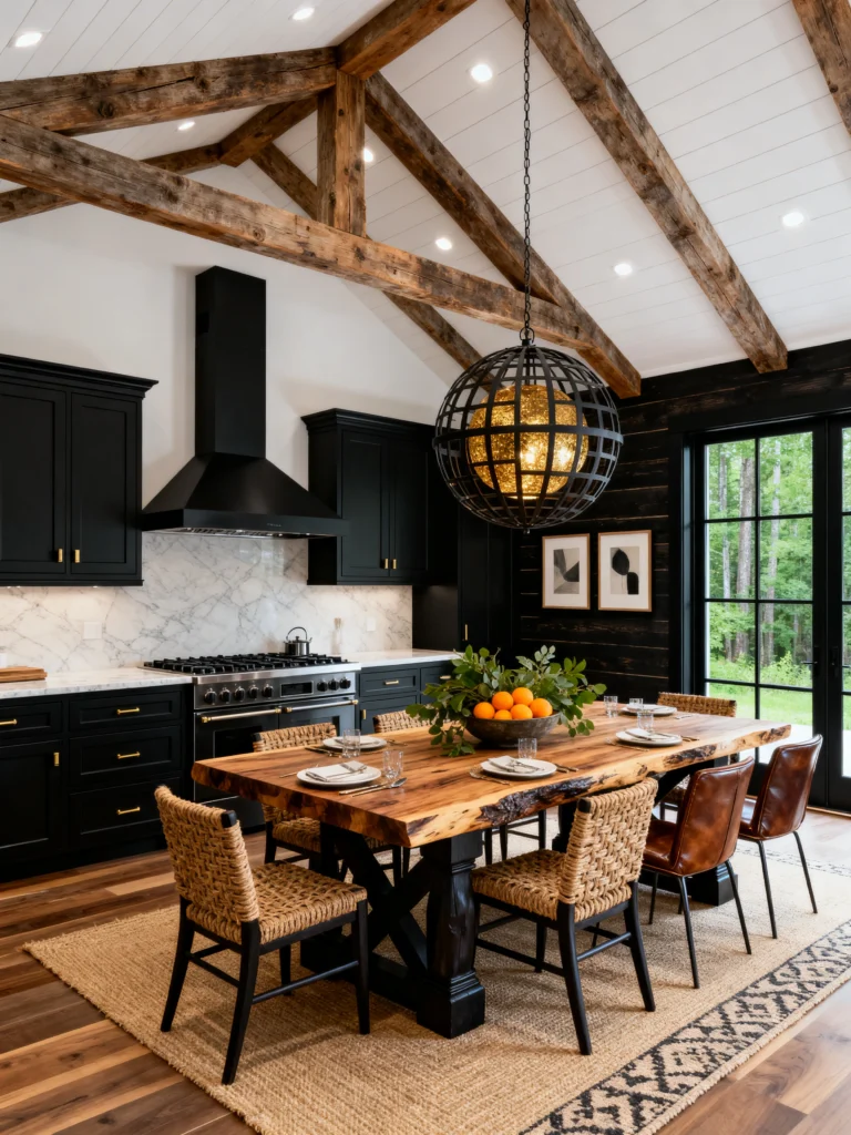 And look at that ceiling! Soaring and vaulted, with beautiful rustic wood beams that add an amazing, cozy warmth. The space has a definite ‘loft’ feel – it’s cool, curated, and entirely its own. That industrial-chic pendant light, with its intricate metal cage and a warm, glowing sphere inside, is the perfect, artistic focal point over the dining table. It’s a kitchen that’s as dramatic as it is inviting, a place where late-night dinners become memorable, cozy affairs. I love a space with clear vision, and this one has it in spades.