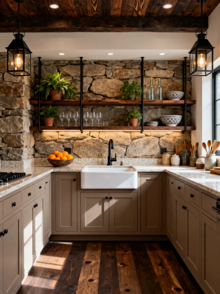 And can we talk about how smart and stylish those open shelves are? Just thick, reclaimed wood planks on sturdy iron supports, but they look so curated and artistic. They turn everyday objects – the potted ferns, the simple glass decanters, and those beautifully patterned ceramic bowls – into a display that’s both functional and deeply aesthetic. It’s a reminder that beauty often lies in simplicity and raw materials. That dark, wide-plank wood floor grounds the whole room, and the farmhouse sink is the perfect, practical final touch. It’s a kitchen with a soul as enduring as the stone it’s built against.