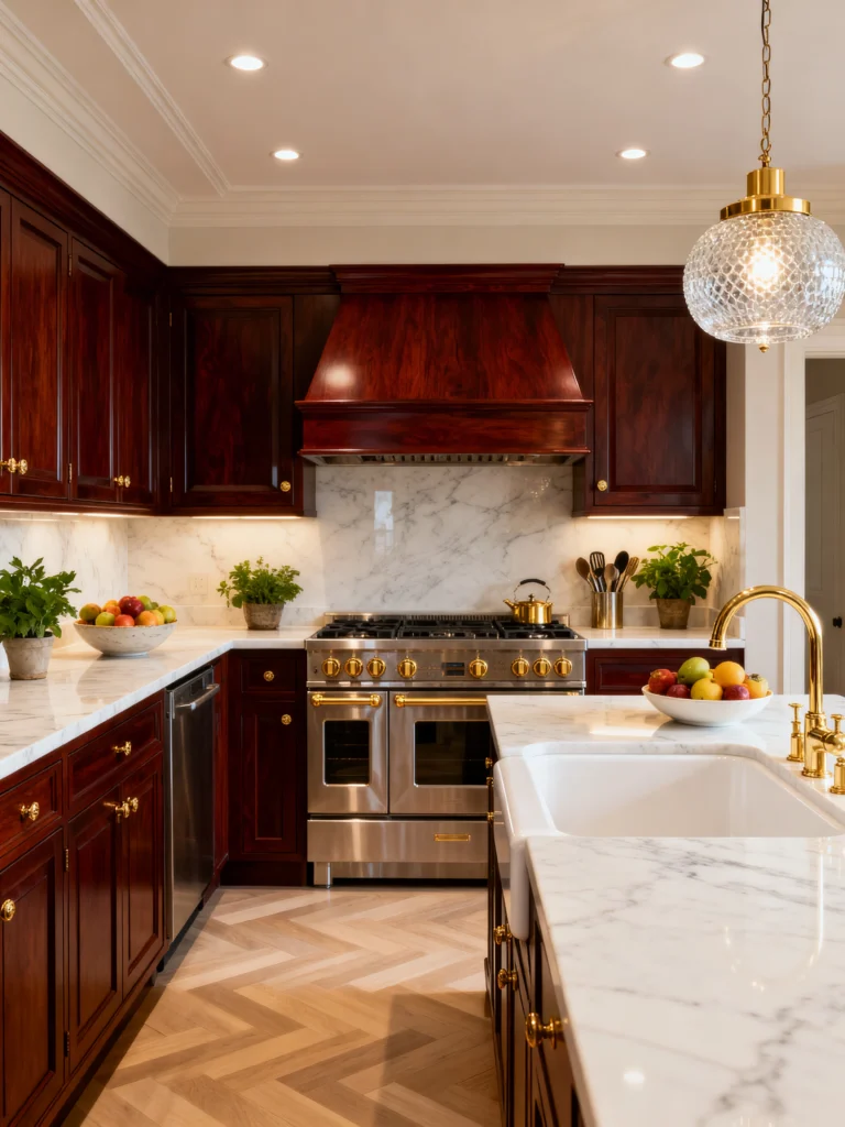 This kitchen is giving me serious classic elegance, with a major modern twist! Let’s start with the cabinets – a stunning, rich cherry wood that feels incredibly luxurious and timeless. You don’t see this warm tone as often these days, but this space proves it’s ready for a comeback. It’s all about how it’s styled, and here, they’ve absolutely nailed it.