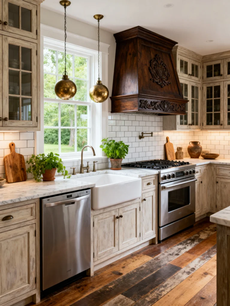 And that wood floor! Deep, weathered, almost like reclaimed barn wood, it adds an amazing layer of texture and history. The classic subway tile backsplash and marble countertops keep things feeling light and fresh, while the stunning, darkly carved wood hood over the stove is a dramatic, historical piece of art in its own right. The pair of simple, aged brass pendant lights hanging from chains over the sink are the perfect, understated final touch. It feels like a kitchen that has seen generations of families gathered, stories told, and meals shared. It’s deeply nurturing and absolutely timeless.