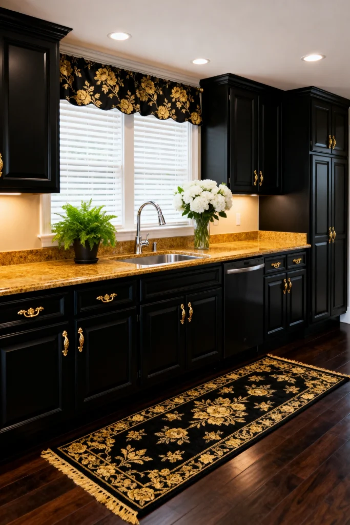 What really pulls this together is the commitment to the “Black and Gold” theme. Look at that runner rug and the matching window valance! The floral patterns break up the solid blocks of color, adding a bit of traditional softness to a very modern, dramatic palette. The ornate gold hardware acts like jewelry for the cabinets, catching the light perfectly. This isn’t just a place to boil pasta; it’s a place to make a statement. If you’re worried about black feeling “too much,” notice how the bright white blinds and the natural light from the window keep things feeling airy and balanced. It’s moody, it’s sophisticated, and it’s undeniably chic.