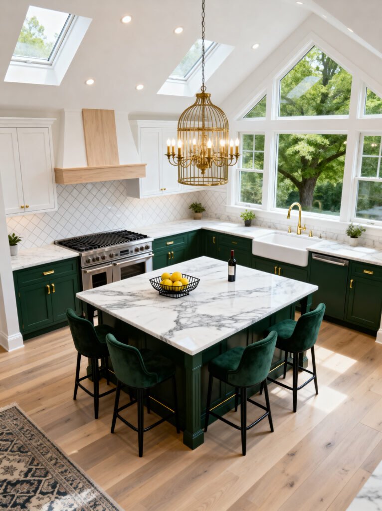 But the real “wow” factor here is that massive, birdcage-style gold chandelier hanging over the island. It’s a total conversation starter! It ties in perfectly with the gold faucet and cabinet pulls. Also, notice the vaulted ceilings and those skylights—if you have a lot of natural light, you can afford to go with a darker, richer color on your cabinets like this. The matching velvet green barstools are the cherry on top, making the island feel like an integrated piece of furniture rather than just a workspace. It’s a bold, regal look that still feels fresh and modern.