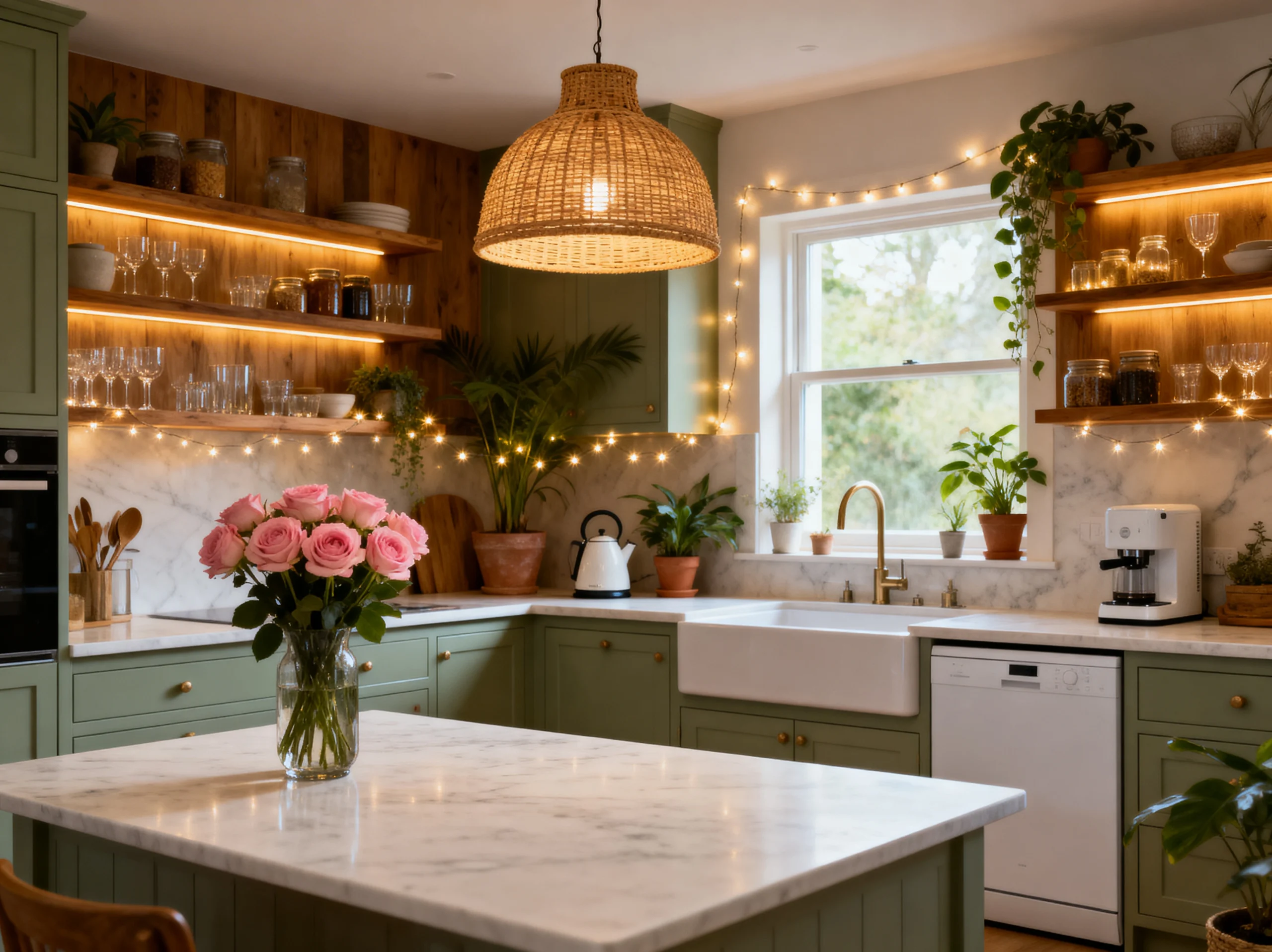 But the real magic? It’s all about that backsplash! Have you ever seen anything like it? It’s covered in these shimmering, iridescent blue-green fish scale tiles. They look like they were plucked straight from a mermaid’s tail, and they catch the light in the most amazing way. It just goes to show that you can totally take design risks, and when you do, the results can be stunning! The unexpected pop of pink from the pendant lights and that gorgeous bouquet of peonies ties everything together with a touch of soft, feminine grace. This is a kitchen with serious personality, and I am here for it!