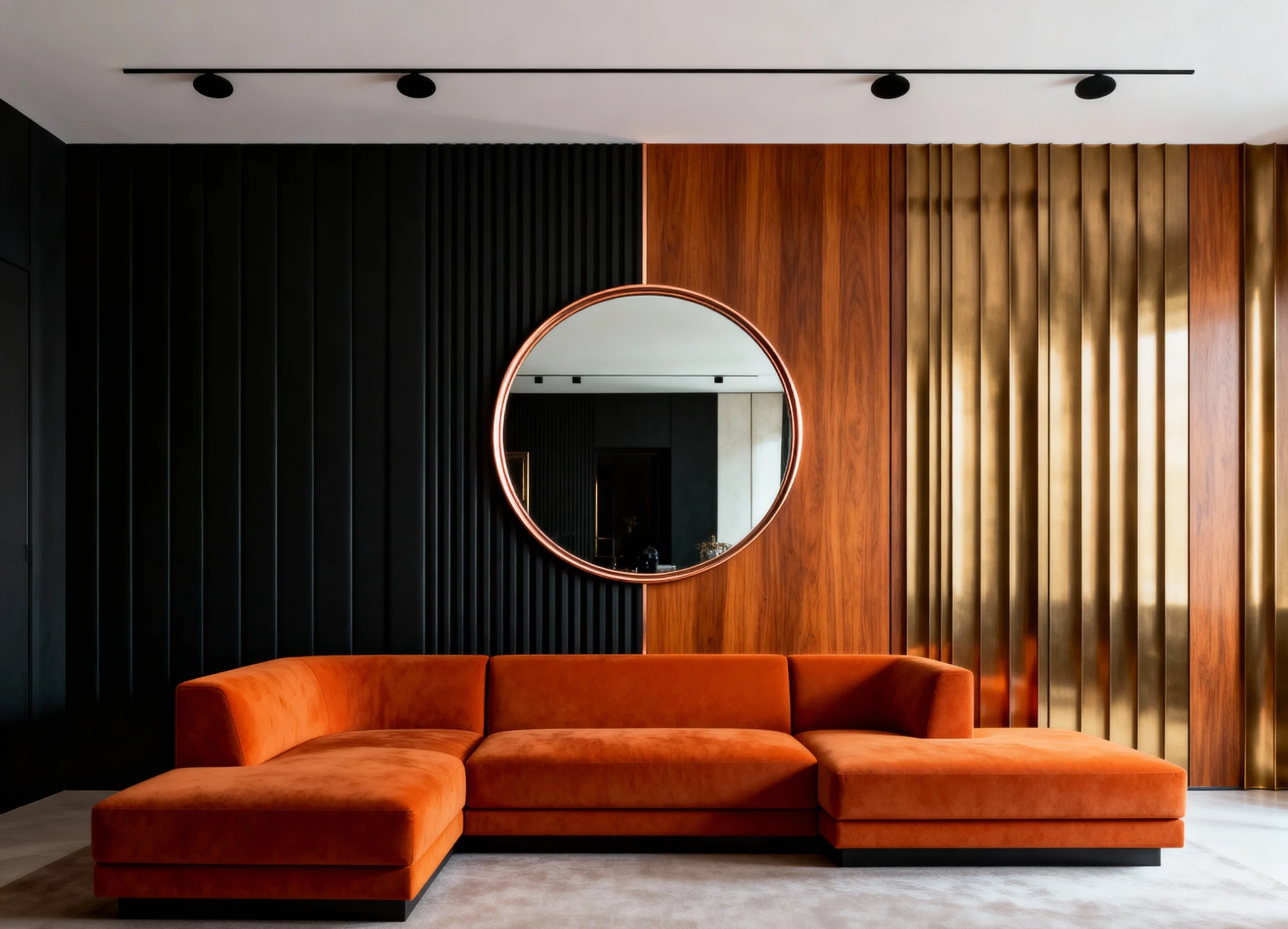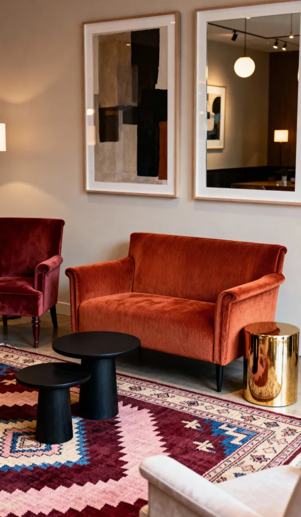 Bold colors and geometric patterns make this space feel vibrant and utterly contemporary. The sofa, in a rich, ribbed terracotta velvet, is the focal point, beautifully contrasted by the sleek, black-pedestal side tables. That gold cylindrical side table adds a necessary metallic gleam, lifting the whole mood. The oversized artwork and the richly patterned rug complete a look that’s modern, luxurious, and full of personality.