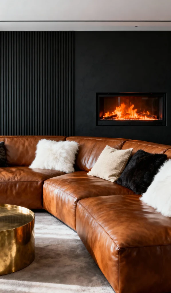 Dark and moody, this room makes a serious statement. The plush, oversized sectional in warm cognac leather looks incredibly inviting. The black paneled wall and sleek, linear fireplace create a dramatic, architectural backdrop. The gold cylindrical side table provides a pop of metallic luxury, contrasting beautifully with the dark elements. It’s a sophisticated, luxurious space designed for ultimate cozy lounging.