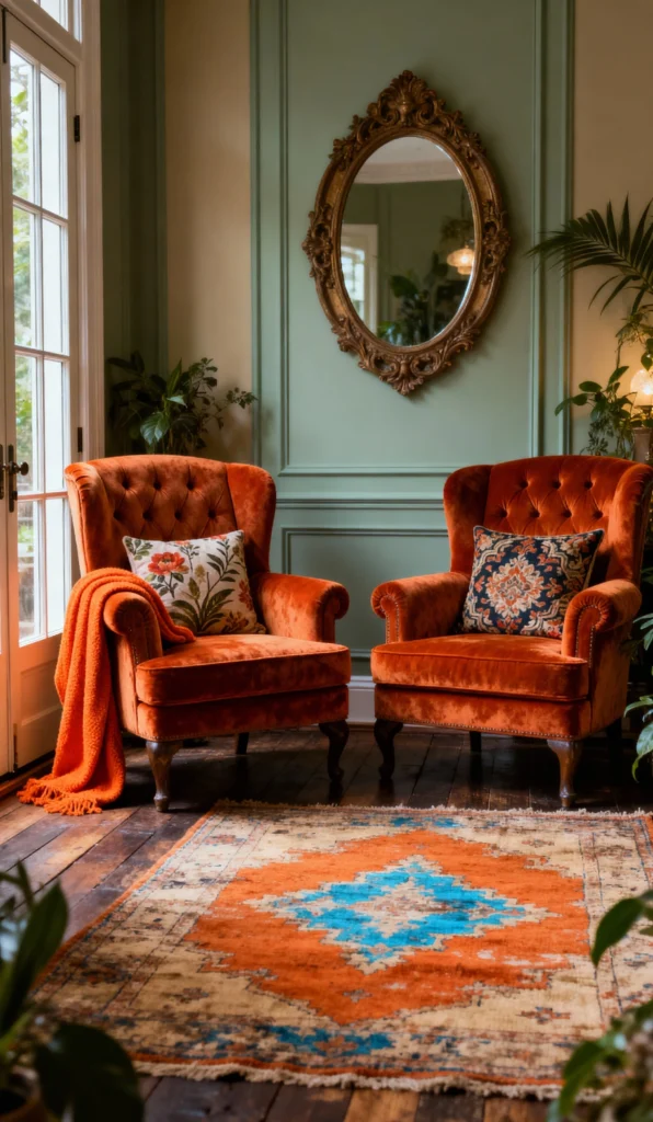 Talk about cozy and dramatic! The pairing of those deep, tufted orange velvet wingback chairs with the serene pale green wainscoting is pure genius. The intricate gold mirror adds a gorgeous vintage touch, making the whole setting feel wonderfully curated and romantic. And check out that rug—the orange and blue pattern ties everything together beautifully. It’s an inviting corner perfect for sinking into with a good book!