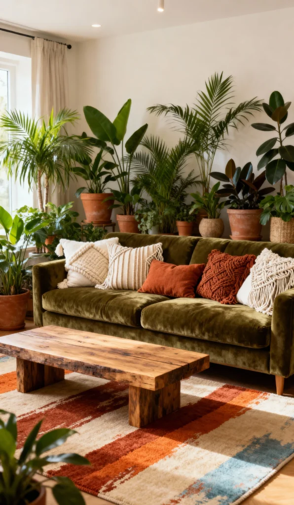 If you love plants, this is your dream room! The deep, moss-green velvet sofa is practically nestled in a lush indoor garden of potted palms and ficus. The warm, rustic wood coffee table and the colorful, striped rug with earthy tones enhance the bohemian, natural vibe. The mix of macramé and textured throw pillows adds layers of comfort and style. It’s a true indoor jungle sanctuary!