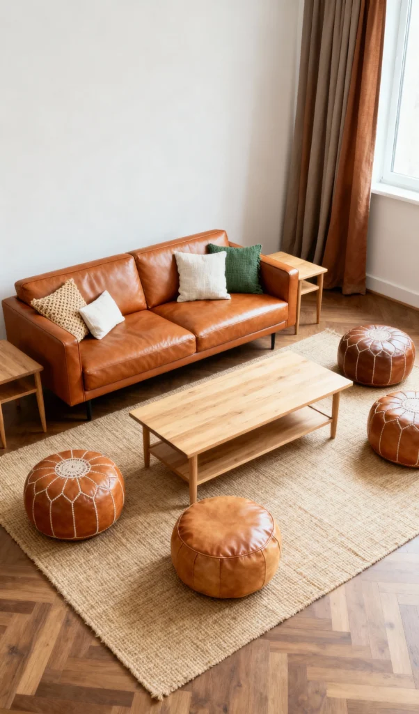 This room is all about laid-back, earthy comfort with a slight bohemian vibe. The warm, genuine leather sofa is perfectly complemented by the woven jute rug and the natural wood coffee table. But the real stars? Those beautiful leather poufs! They offer versatile seating and a wonderful, tactile texture. The entire arrangement feels light, airy, and incredibly relaxed—a truly inviting space to gather.