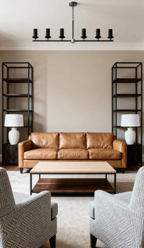 This space achieves a beautiful sense of calm through perfect symmetry. A comfortable, light brown leather sofa is flanked by identical black metal shelving units and matching white gourd-style lamps. The neutral wall color allows the clean lines and textures to shine. The mixed-material coffee table grounds the center, while the patterned armchairs offer a soft, contrasting texture. It’s an executive look that feels polished and very put together.