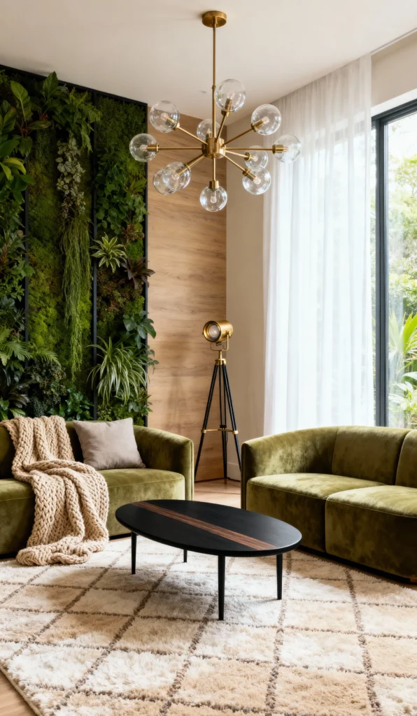 This room is an absolute breath of fresh air! That floor-to-ceiling living green wall completely transforms the space into an urban jungle retreat. Paired with the rich, olive-green velvet sofas and the natural wood paneling, it creates a wonderfully harmonious blend of modern and organic. The chic Sputnik chandelier and the chunky knit throw add just the right amount of cozy luxury. It’s the perfect spot to unwind and feel instantly rejuvenated.