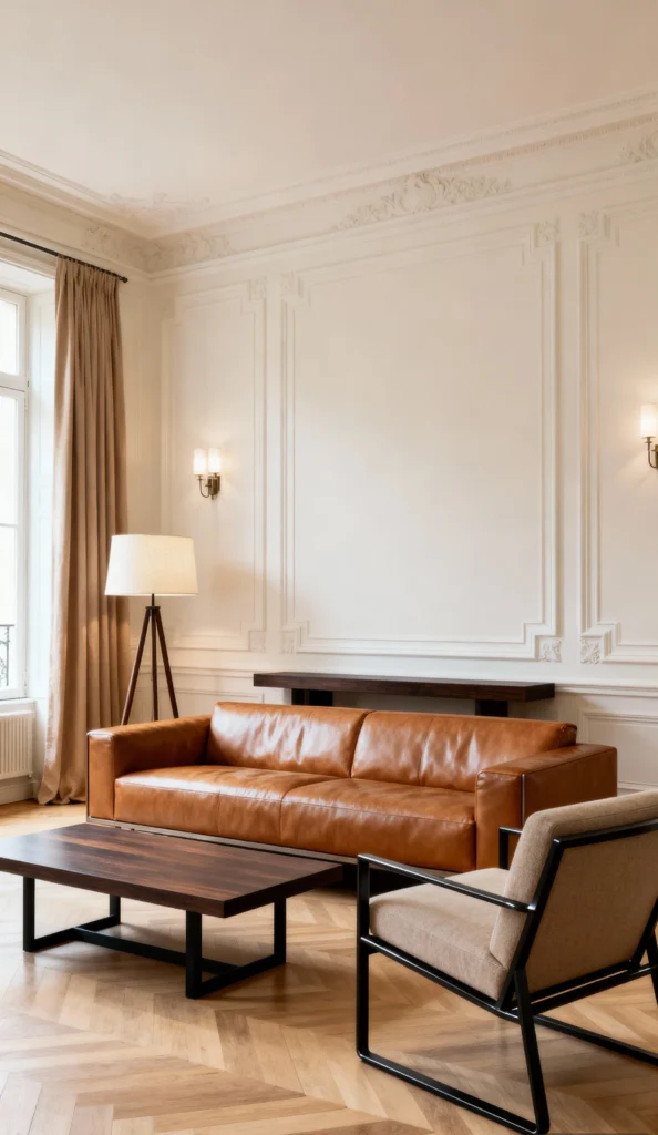 Elegance is the name of the game here. The Parisian-style wall paneling and ornate ceiling molding provide a sophisticated backdrop for the modern furnishings. A handsome brown leather sofa and a dark, minimalist wood coffee table anchor the room with a sense of refined taste. The tripod floor lamp adds a contemporary element, while the long, soft drapes frame the natural light beautifully. It’s a perfect blend of old-world charm and modern functionality.