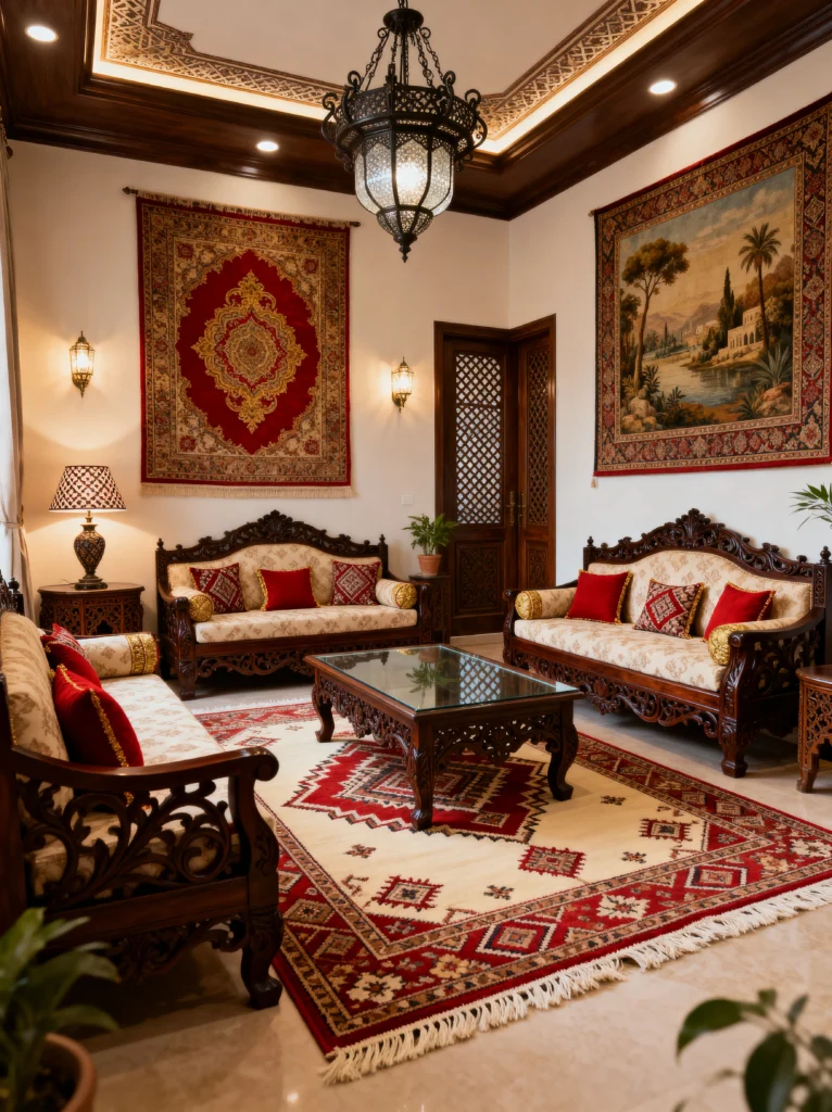 This isn’t just a place to sit; it’s a masterclass in traditional Moroccan elegance. The dark, intricately carved wood of the sofas (the sedari) creates such a stunning contrast against the creamy walls. I love how the red and gold textiles tie everything together—from the plush velvet pillows to that gorgeous wall tapestry.