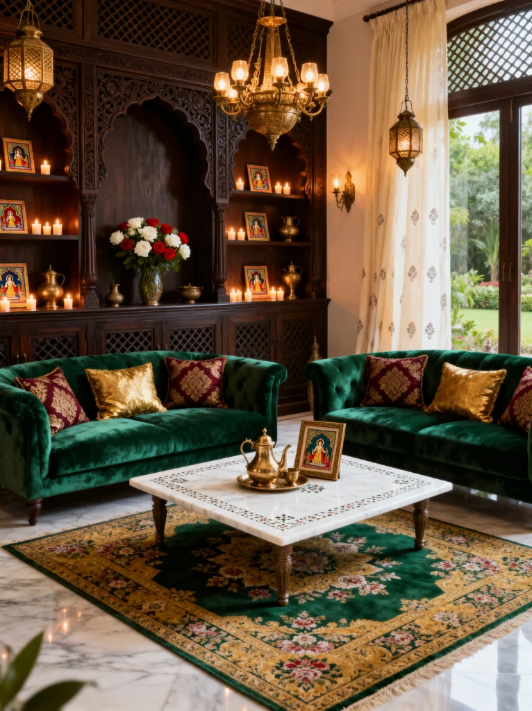 The deep emerald green chesterfield sofas are the perfect choice to anchor such a busy wall. They feel solid and luxurious. I love the marble-topped coffee table with the brass tea set—it’s so inviting. The green floral rug ties the furniture to the view of the garden outside, making the whole room feel like a seamless transition from the interior to the outdoors. This isn’t just a living room; it’s an experience.