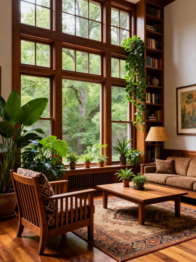 If I could move into any room today, it might be this one. This is the ultimate Woodland Sanctuary. Those floor-to-ceiling windows are a total dream, especially with that lush green view outside. It feels like the room is actually part of the forest! The warm wood tones of the window frames and the built-in bookshelves make the whole space feel so grounded and sturdy.