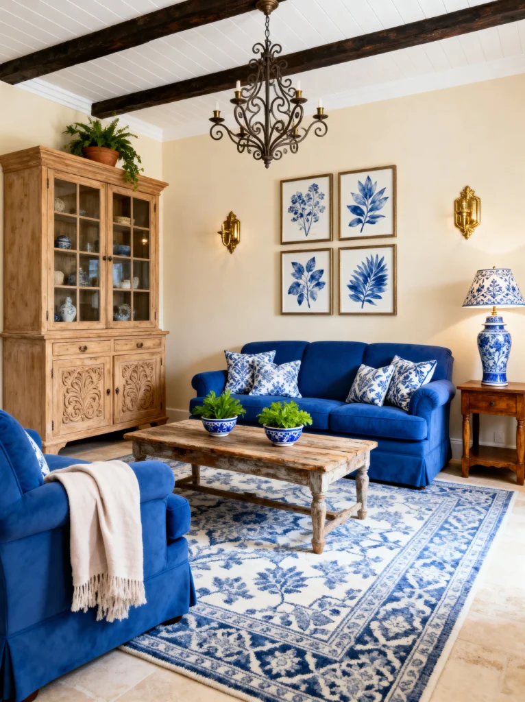 There is something so crisp and refreshing about a blue-and-white color scheme, isn’t there? This room feels like a Maritime Escape. The vibrant cobalt blue of the sofa and chairs is such a confident choice, and it looks amazing against the creamy walls. It reminds me of a luxury villa by the Mediterranean.