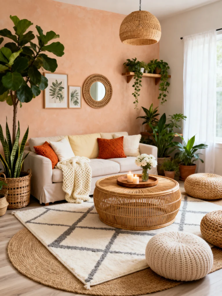 The “Boho” style can sometimes get a bit cluttered, but this feels perfectly balanced. You’ve got the natural textures like jute and wicker mixed with soft, comfy textiles. And the plants! The Fiddle Leaf Fig in the corner adds just the right amount of height and life. It’s the kind of room where you can kick off your shoes, sit on the floor, and just relax. It feels very “young at heart” and full of personality.