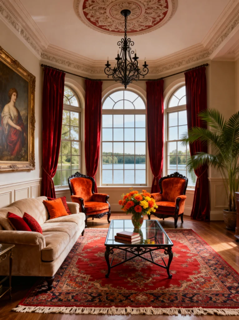 Talk about a “wow” factor. This room is pure Grand Drama. The first thing your eyes go to are those massive arched windows draped in heavy red velvet. It’s such a bold, theatrical look! And the view of the lake outside? It’s like something out of a period movie.