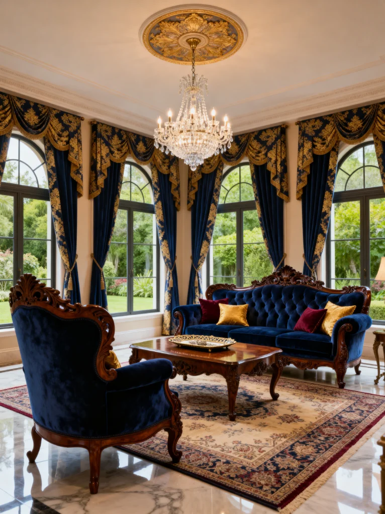 Everything here feels expensive and handcrafted. The way the blue curtains are draped with gold tassels matches the sofa perfectly, and the marble floors just scream luxury. But even with all that opulence, the large windows let in so much natural light that the room still feels bright and energized. It’s definitely a “special occasion” kind of room—very fancy, very French-inspired, and totally breathtaking.