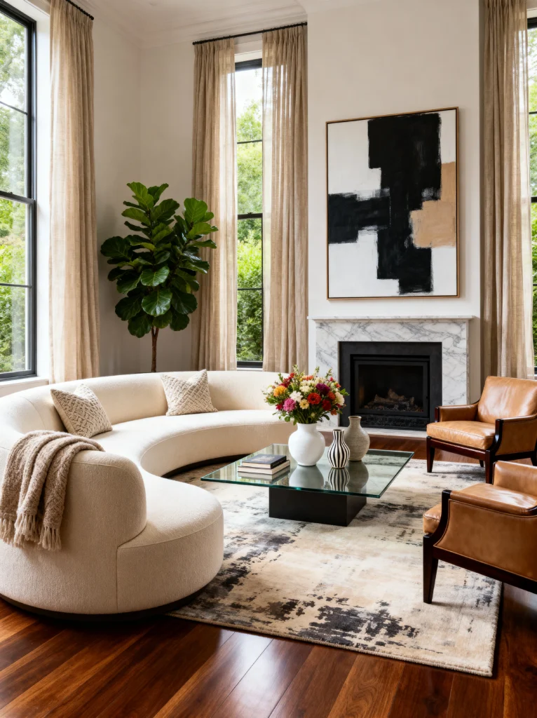 Finally, we have this stunning Contemporary Chic space. After all those traditional rooms, this one feels so fresh and updated. The star of the show is definitely that curved cream sofa. It’s such a modern silhouette and it makes the seating area feel really inclusive and conversational.