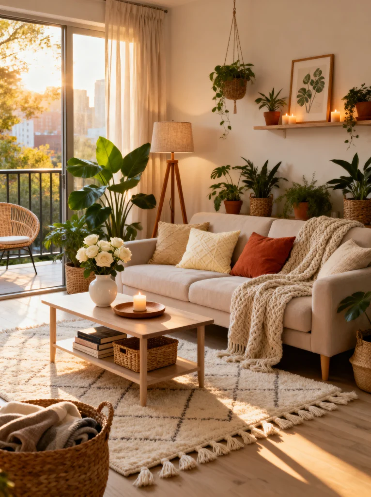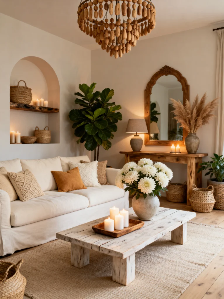 This room feels like one big, warm hug from the sun. The vibe here is effortlessly “Boho-Chic,” focusing on natural textures like that chunky knit throw, the jute baskets, and the wooden tripod lamp. It feels so lived-in and breathable.
