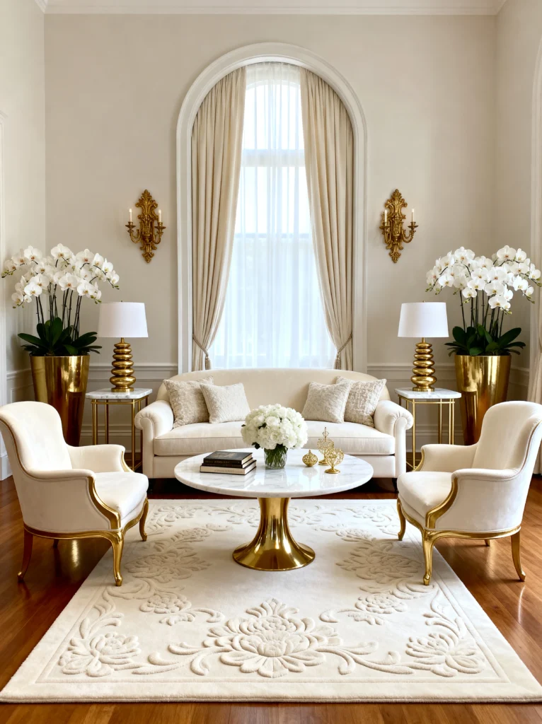 This is for the person who loves a “Hotel Luxe” feel at home. Everything about this space screams sophisticated symmetry. The arched window is a huge focal point, framed perfectly by those heavy, floor-to-ceiling cream drapes. But the real stars here are the gold accents. Those metallic planters and the ornate wall sconces add just the right amount of “wow” factor without feeling gaudy.