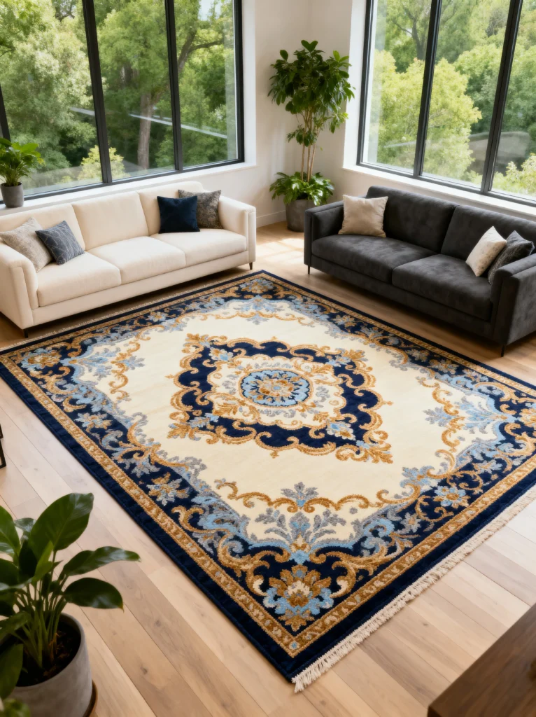 Sometimes, one piece of furniture or decor can dictate the entire energy of a room. In this case, it’s that massive, intricate rug. The deep navy and gold patterns are so bold that they actually allow the rest of the room to be quite minimal. I really like how they used two different colored sofas—one creamy white and one charcoal grey—to pick up the different tones in the rug’s border.
