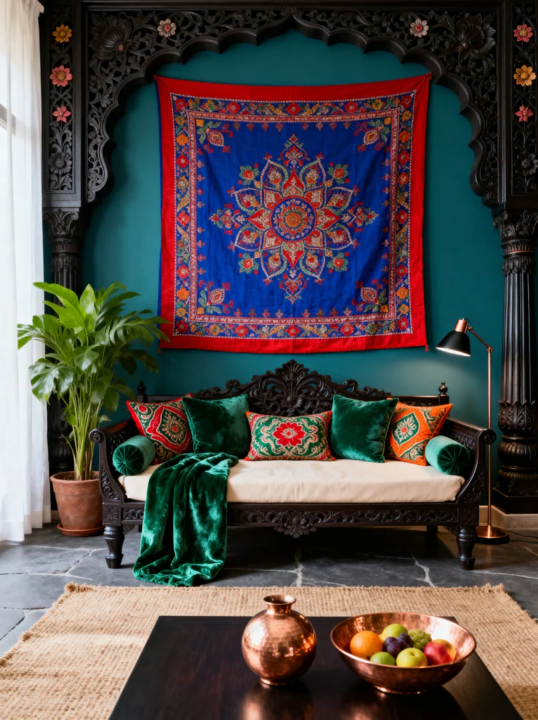 Can we talk about that wall color? That deep teal is breathtaking. This room feels like a hidden jewel box. The star is definitely the dark, hand-carved daybed, which looks like a piece of art on its own. But when you layer on those emerald green velvet pillows and the matching throw, it becomes pure luxury.