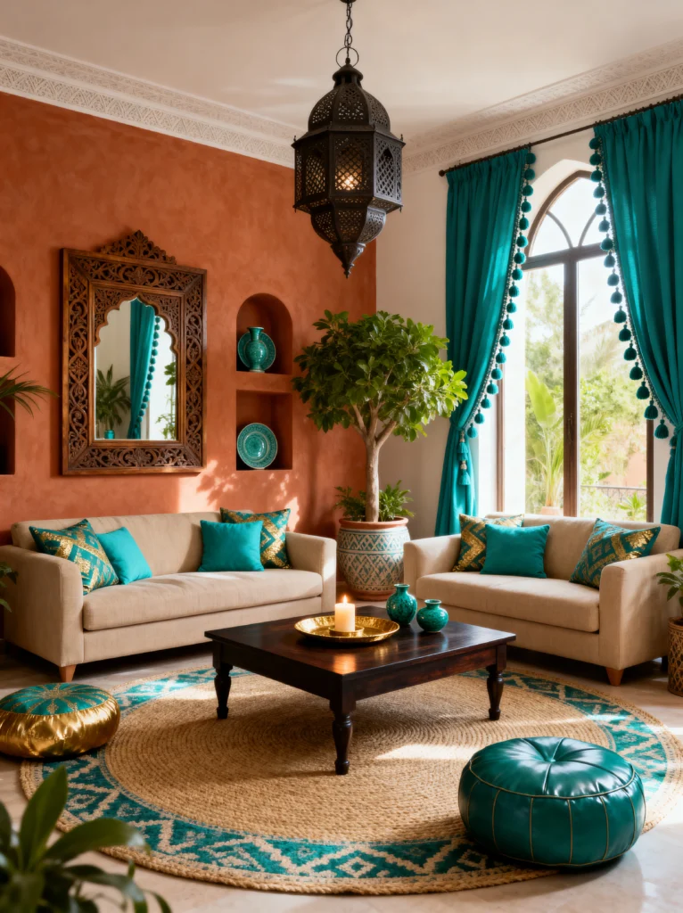 This room feels like a sunset in Marrakesh. That terracotta-colored accent wall is such a bold choice, and it pays off beautifully. It provides the perfect backdrop for the carved wooden mirror and the built-in shelving niches. The contrast with the bright turquoise curtains and pillows is genius—orange and blue are opposites on the color wheel, so they naturally make each other look more vibrant.