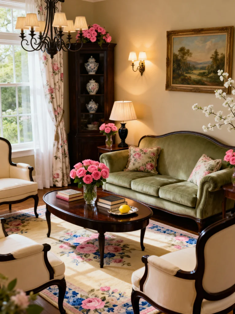 The dark wood corner cabinet and the ornate chandelier add a sense of age and permanence to the room. I love the abundance of fresh pink roses—they bring the floral prints on the rug and fabrics to life. It’s a very feminine, gentle space that feels like it has a story to tell. It’s cozy, sweet, and perfectly curated for someone who appreciates the finer, vintage-inspired details.