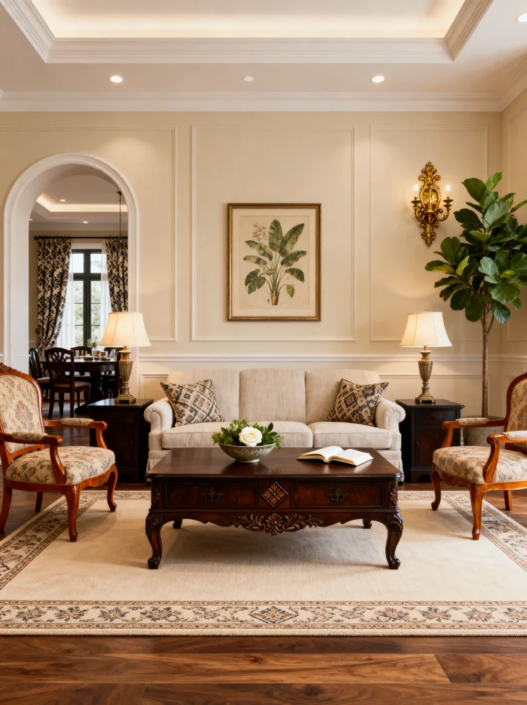 The lighting really seals the deal here. That oversized, blackened metal lantern hanging from the tray ceiling gives off such a warm, inviting glow that makes the wood grain pop. Notice the symmetry, too. Having two identical sofas facing each other over a glass-topped carved table makes the room feel balanced and formal, yet the richness of the rugs makes you want to kick off your shoes and stay a while. It’s a perfect blend of “don’t touch” museum beauty and “please stay” comfort.