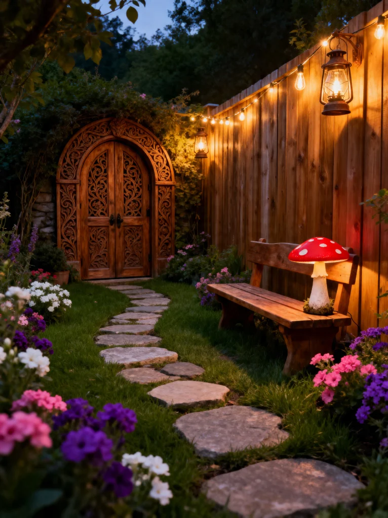 I’m also obsessed with the lighting here. Those warm string lights against the wooden fence create such a glowy, inviting atmosphere for a late-evening stroll. And can we talk about that mushroom lamp? It’s such a quirky, whimsical touch that keeps the space from feeling too serious. The stone path is perfectly “imperfect,” winding through a sea of purple and pink flowers. If I had this in my backyard, I’d probably spend every twilight hour right here on that wooden bench, waiting for a woodland creature to come and tell me a quest. It proves that you don’t need a massive estate to create a sense of wonder—just the right details and a little bit of imagination.