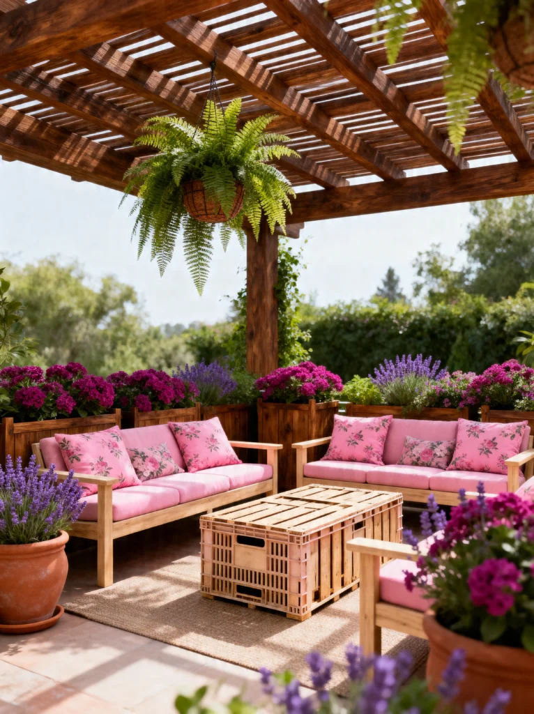 What I love most about this setup is the layering. You’ve got the hanging ferns adding texture from above, the lavender in the terracotta pots bringing in that amazing scent, and those deep purple flowers in the wooden planters acting as a natural fence. It’s like a hug made of plants! And check out that coffee table—it looks like a repurposed wooden crate, which adds such a cool, rustic touch to the more polished furniture. It’s the perfect spot for a weekend brunch with your best friends. To get this look, don’t be afraid to mix your shades of pink and purple. It creates a rich, tonal look that feels designer but totally approachable.