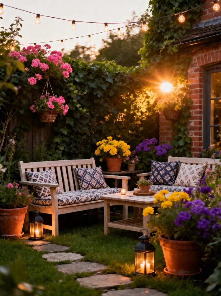 I really appreciate the choice of patterned cushions here; the navy and white prints give it a bit of a “cottage-core” feel that’s super trendy right now. And look at the stone path! Using irregular flagstones tucked into the grass makes the walk to the seating area feel like an adventure. If you want to level up your evening garden game, lanterns are the way to go. You don’t even need fancy wiring—just some battery-operated candles inside a glass lantern can completely change the vibe. It’s about creating “pockets” of light that draw you into the space. Imagine sitting here with a glass of wine while the sun goes down… total bliss.