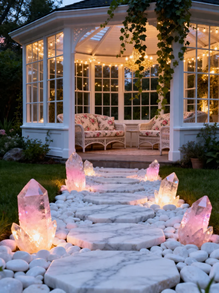 Instead of just regular stepping stones, they’ve used marble-look slabs surrounded by smooth white river rocks. But the “wow” factor? Those giant, glowing rose quartz crystals! It’s such a unique way to light a path. It feels ethereal and spiritual. Inside the pavilion, the floral-patterned sofas and the chandelier (yes, a chandelier in the garden!) take luxury to a whole new level. This is the ultimate “she-shed” or garden conservatory. Even if you can’t build a whole gazebo, you can take inspiration from this by using white stones or crystals in your landscaping to brighten up shady corners. It reflects light beautifully and makes everything feel clean and high-end.