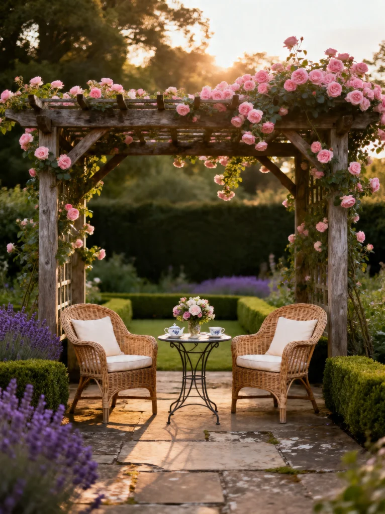 This is the definition of “English Garden” goals. That weathered wooden pergola covered in soft pink climbing roses is just breathtaking. The way the sunlight filters through the petals… it’s like poetry.