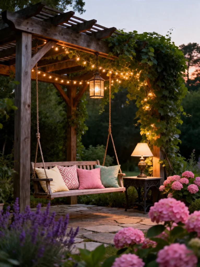 This one is for the dreamers. There is nothing more nostalgic than a porch swing, but putting it under a vine-covered pergola in the middle of the garden? That’s next level. The lighting here is so clever—you have the delicate string lights, a hanging iron lantern, and even a small table lamp.