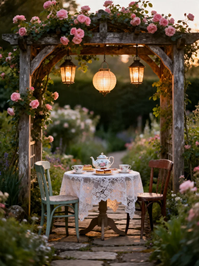 Can you hear the birds chirping? Because I definitely can. This setup feels so intimate and personal. The lace tablecloth over the small round table is such a vintage, feminine touch that contrasts beautifully with the rugged, dark wood of the rose-covered arbor.