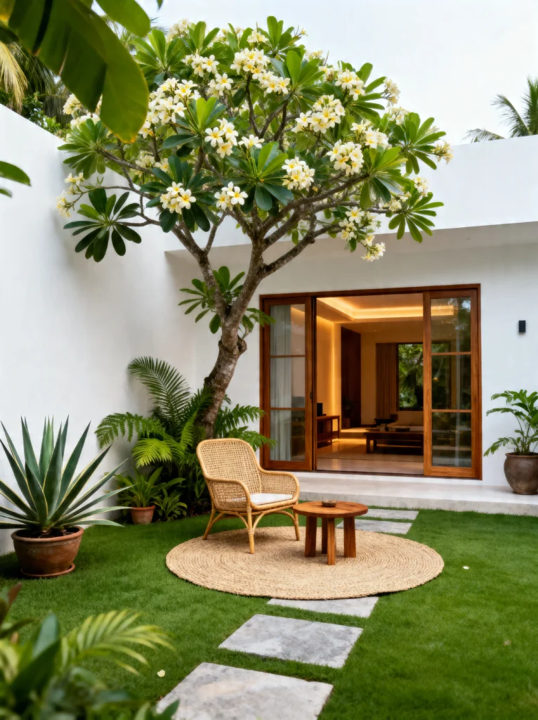 Now, let’s flip the script. If the first image was a dark fairytale, this one is pure, sun-drenched serenity. This is exactly what I picture when I think of a “minimalist paradise.” The clean white walls provide such a sharp, beautiful contrast to the vibrant green grass and that stunning flowering tree (looks like a Frangipani!). It’s so tidy and intentional.