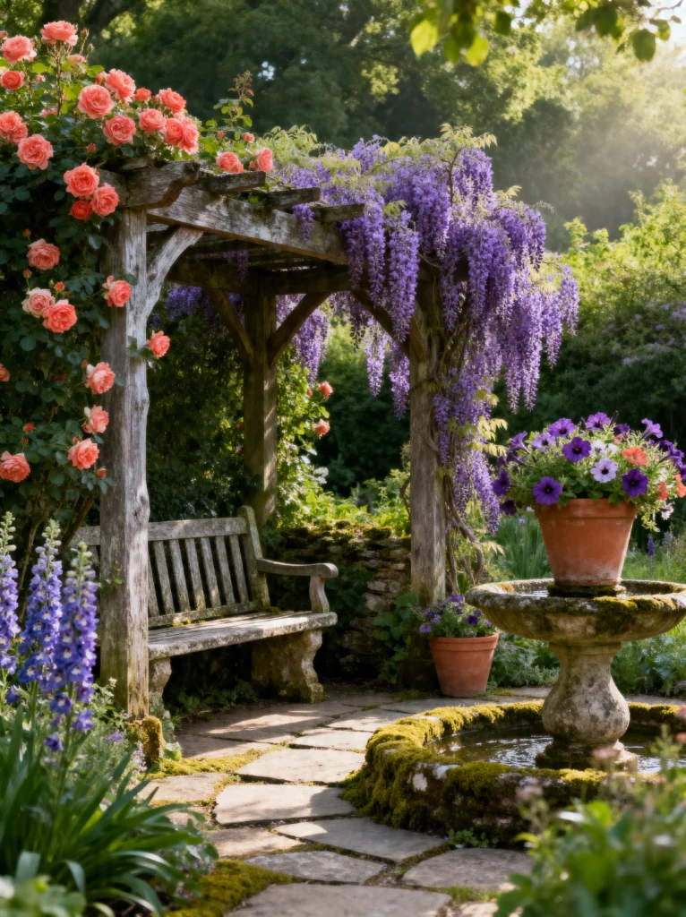 The centerpiece here is that mossy stone fountain. There’s something so soothing about the sound of trickling water, and having a pot of bright petunias sitting right on top is such a clever way to add height to the floral display. The bench tucked under the pergola looks like the ultimate spot to hide away with a sketchbook. Everything feels established and “lived-in,” which gives it a soulful, romantic energy. It’s the kind of garden that encourages you to slow down and notice the bees buzzing or the way the light filters through the leaves. If you have a corner of your yard that feels a bit empty, a simple wooden structure and some climbing vines can completely transform it into a sanctuary like this.