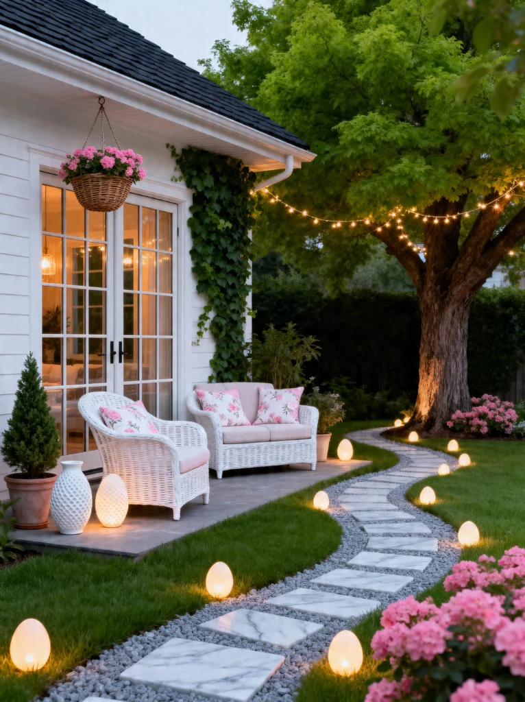 The white wicker furniture on the patio looks so crisp and inviting against the white siding of the house. I love the addition of the pink floral pillows; they tie in perfectly with the massive hydrangea bushes along the lawn. Also, check out the string lights draped from that big, beautiful tree—it adds a canopy of light that makes the whole yard feel like a room. This is a masterclass in using “layers” of light: you’ve got the hanging lights, the glowing floor ornaments, and the warm glow coming from inside the house. It’s sophisticated, cozy, and perfect for hosting a summer dinner party that lasts long after the sun goes down.