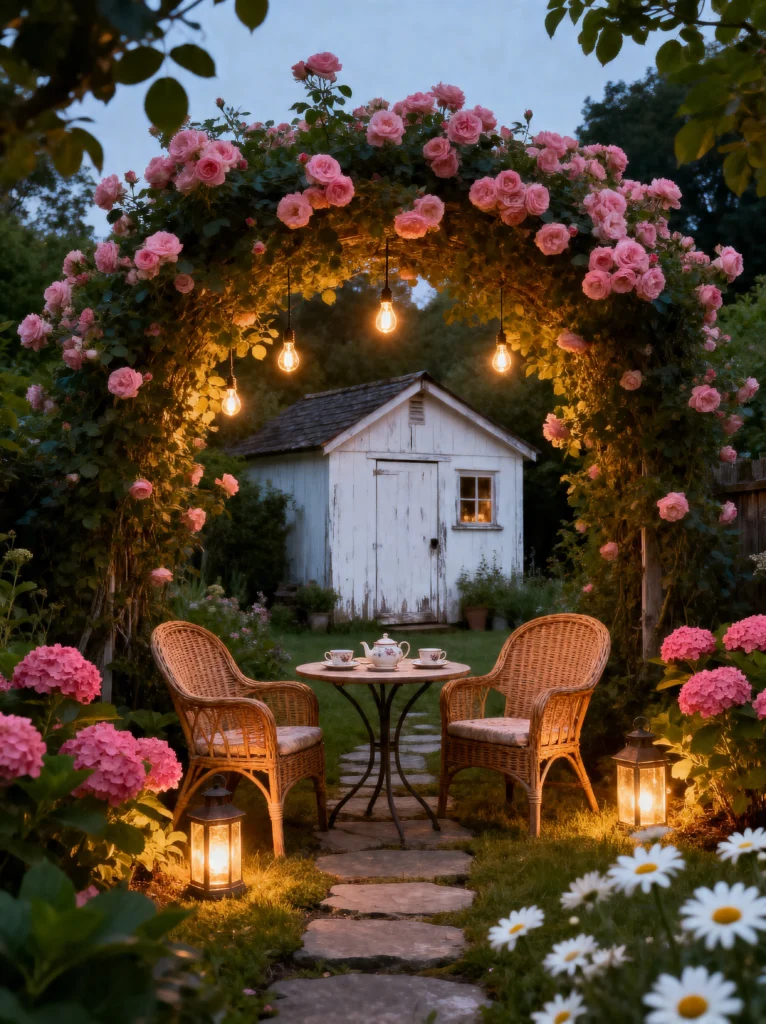 I am officially inviting myself over to this garden for tea! This is the epitome of a romantic evening retreat. The rose-covered archway is just spectacular—it’s so dense and lush, and those hanging Edison bulbs inside the arch create such a warm, golden focal point. It draws your eye right through to that charming little white garden shed in the back.