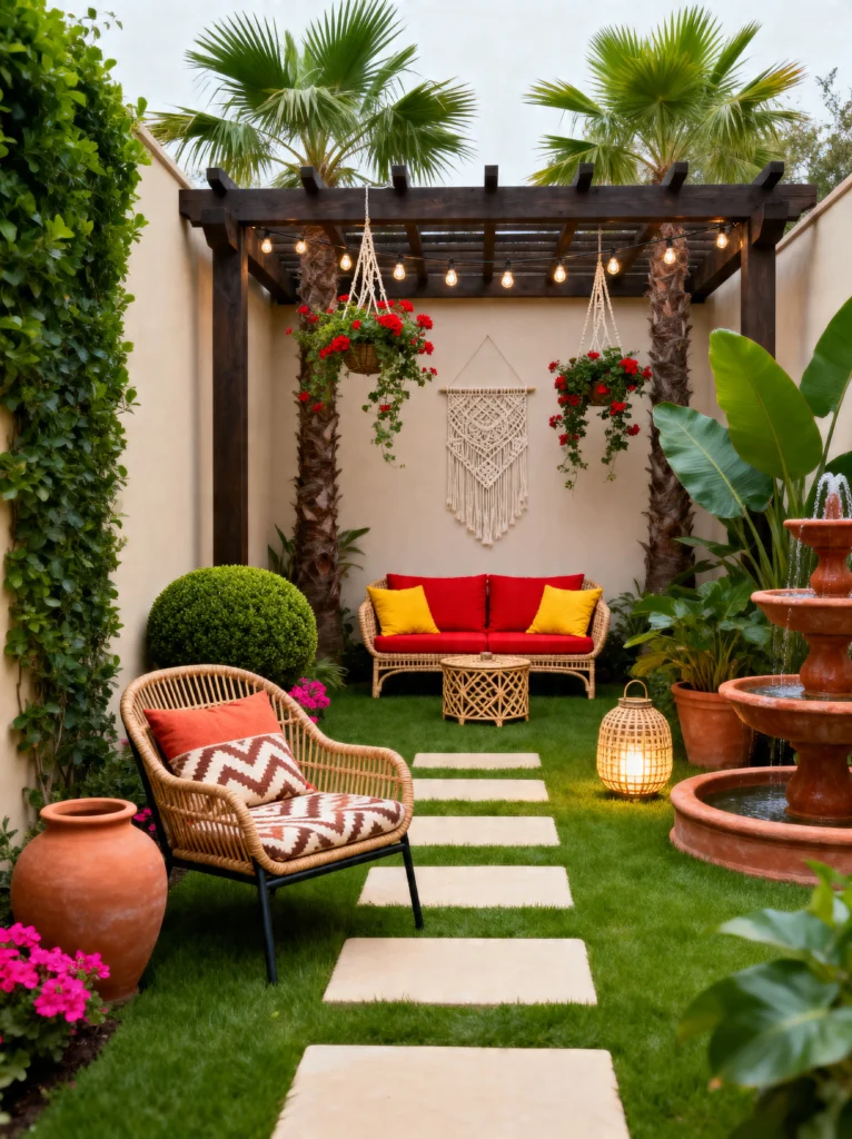The color palette is so bold and fun—the bright red cushions on the wicker sofa paired with the yellow accent pillows really pop against the neutral walls. And look at that tiered terracotta fountain! It adds a touch of luxury and movement to the space. The use of large potted plants like the banana leaf and the perfectly round boxwood shrub creates a variety of shapes that keep the eye moving. Even the stepping stones in the grass feel deliberate and stylish. It’s a cozy, vibrant “outdoor room” that feels completely private from the rest of the world. It’s the perfect example of how to use vertical space (the walls and the pergola) to make a small area feel much larger and more immersive.
