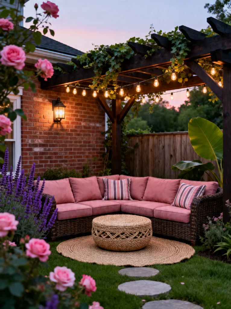 The lighting here is very classic—globe string lights draped under the heavy timber pergola. It creates a “ceiling” that makes the lounge area feel cozy and protected. I love how they’ve integrated the landscaping right up to the edge of the seating area, with purple salvia and pink roses peeking into the frame. It makes the furniture feel like it’s part of the garden rather than just sitting on top of it. The round, woven ottoman is a great multi-purpose piece too—it’s a table, a footrest, or extra seating. This is a very achievable look if you have a patio area; it’s all about choosing a color theme and sticking to it for a polished, “designer” finish.