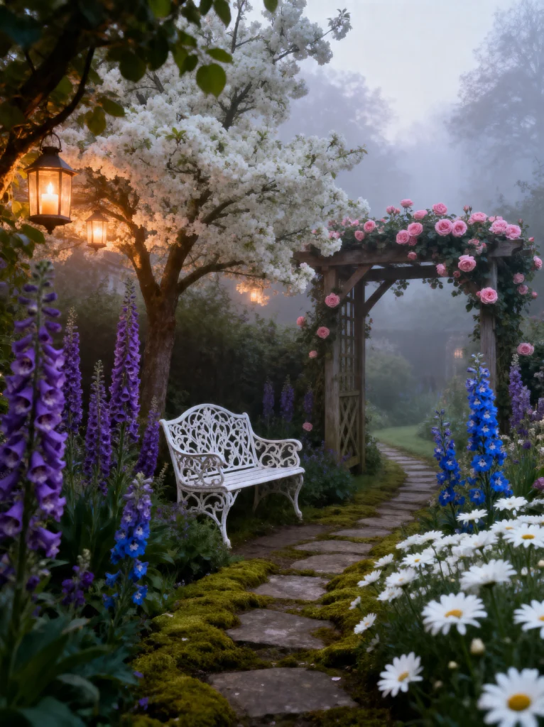 The way the moss has grown over the stone path makes it look like it’s been there for a hundred years, and that flowering white tree overhead is just stunning. But the real “wow” factor? The lanterns hanging from the tree branches. They look like little floating embers in the fog. This garden isn’t about clean lines or modern furniture; it’s about texture, height, and a sense of history. The rose-covered trellis in the background adds another layer of depth, leading your eye further into the misty landscape. It’s a reminder that gardens are at their most beautiful when they feel a little bit wild and untamed. It’s a place for dreaming, for quiet mornings, and for feeling completely connected to nature.