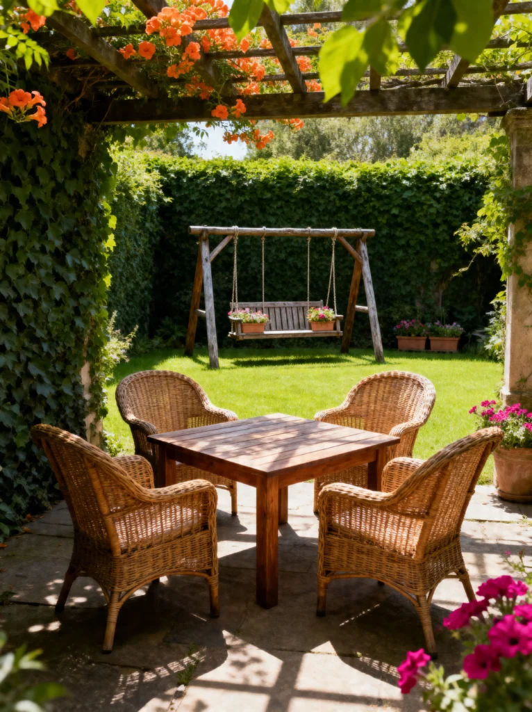 The wicker chairs are such a smart choice here. They’re timeless, and when you pair them with a solid wood table, it feels grounded and earthy. But the real star for me? That wooden swing in the background. Can you imagine just swaying there with a book while the kids (or the dog) run around on that lush green grass? It’s the kind of setup that invites you to stay for hours. If you’re looking to recreate this, focus on vertical greenery. Covering your walls or posts in ivy or climbing flowers instantly makes a yard feel older, more established, and way more private. It’s all about creating that “secret hideaway” vibe right in your own backyard.
