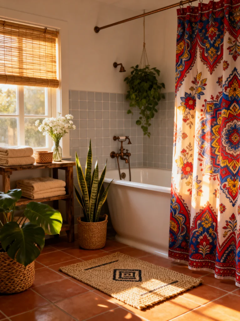 If you want your morning shower to feel like a vacation in a Mediterranean villa, this is the blueprint. This look is all about warmth and texture. The star of the show is that gorgeous, intricate mandala shower curtain—it brings in such a rich, sunset-inspired palette of reds and blues.