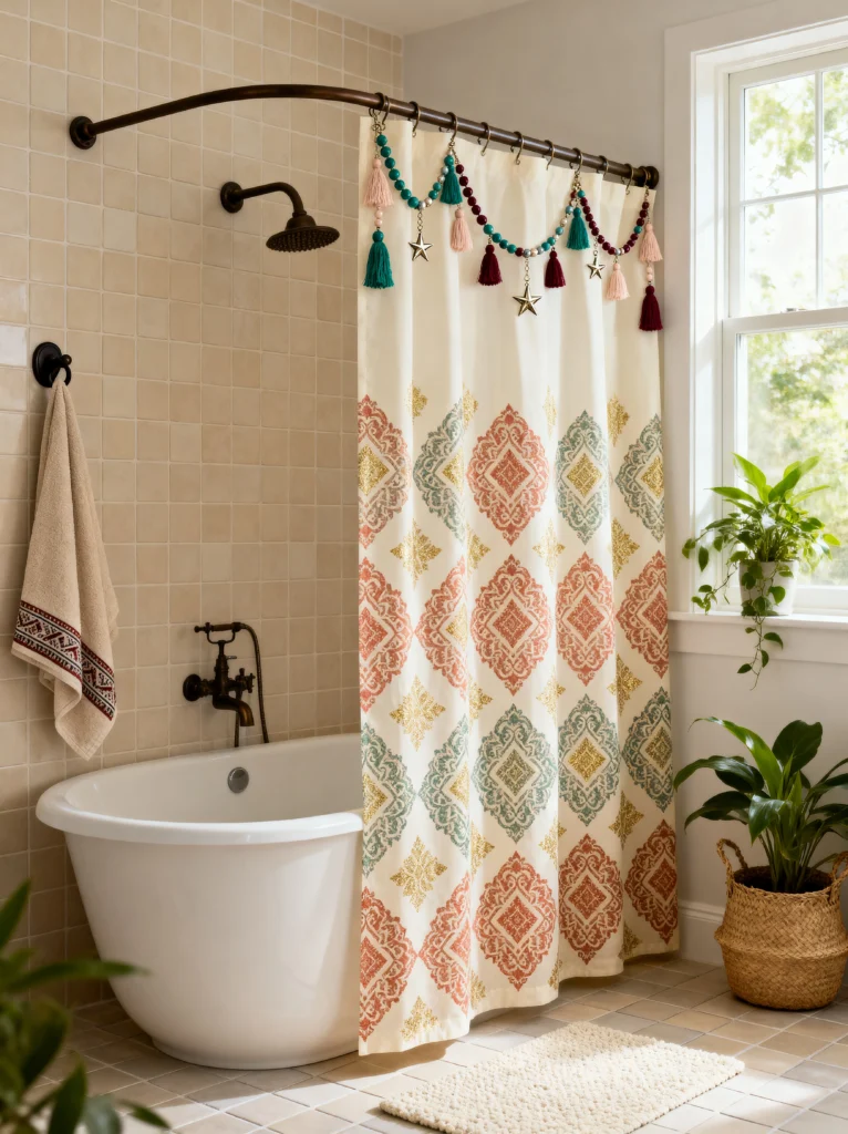 This bathroom proves that you don’t need a full renovation to make a massive impact. It’s a “boho-lite” look that feels sophisticated but playful. The cream-colored shower curtain with its subtle geometric print is elevated to a whole new level by that colorful beaded garland across the top. It’s such an easy DIY-style upgrade!
