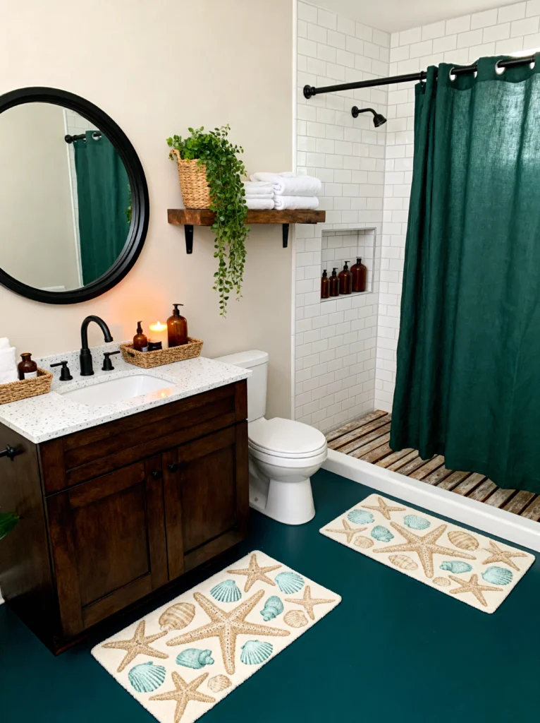 But the real “wow” factor? The floor. That dark teal/emerald floor color makes the whole room feel expensive and curated. To keep it from feeling too heavy, they’ve used a light-colored vanity with a speckled countertop and some really fun starfish-patterned rugs. It’s a clever way to do a “coastal” theme without it feeling like a cheesy gift shop. Also, take a peek at that shower floor—using a wooden slat base (a duckboard) adds a wonderful organic texture underfoot. It’s practical, helps with drainage, and gives off major high-end sauna vibes.