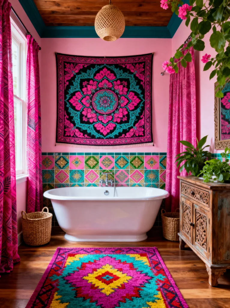 Okay, this one is for the maximalists! If you want a bathroom that wakes you up faster than a double shot of espresso, here it is. This is a masterclass in “Dopamine Decor.” We’re talking bright pink walls, a massive neon mandala tapestry, and those incredible jewel-toned tiles.